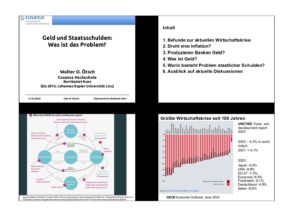 [Prof. Ötsch im Vorspann:] „Die riesigen Rettungspakete aus dem Corona-Schock haben zu lauten Warnungen vor einer drohenden Inflation geführt. Wenn der Staat so viel neue Kredite aufnimmt und wenn die Zentralbanken ihre Bilanzsumme erhöhen, dann muss das – so wird oft gesagt – zu einer hohen Inflation führen. Aber sind diese Warnungen überhaupt berechtigt und auf welchen Theorien beruhen sie? Diese und andere grundsätzliche Fragen werden im Vortrag angesprochen: Was ist Geld und wie kann neues Geld geschaffen werden? Was bedeutet es Schulden aufzunehmen und welche Rolle nehmen Staatsschulden ein? Wie kann man die neuen Aufgaben für den Staat finanzieren? Geht das auf Kosten der nächsten Generation?“